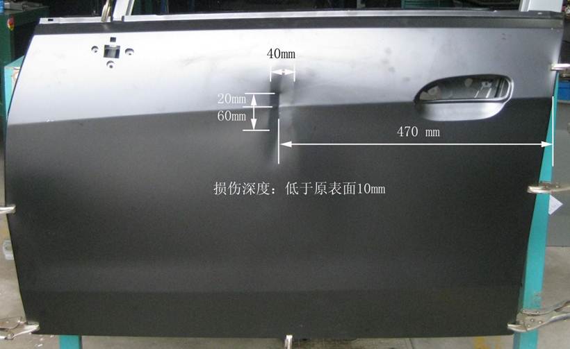 2013年車身修復大賽受損門板修復項目技術方案的補充說明 2013-05-16 19035 2013年車身修復大賽受損門板修復項目技術方案的補充說明 1、受損門板項目的受損位置及尺寸圖片、作業(yè)要求(1)作業(yè)要求在40分鐘內,對雪佛蘭新賽歐左前門外板上的長80mm,寬40mm,深10mm的條形凹陷(漆膜已破壞)進行修復,凹陷損傷穿過車身線。