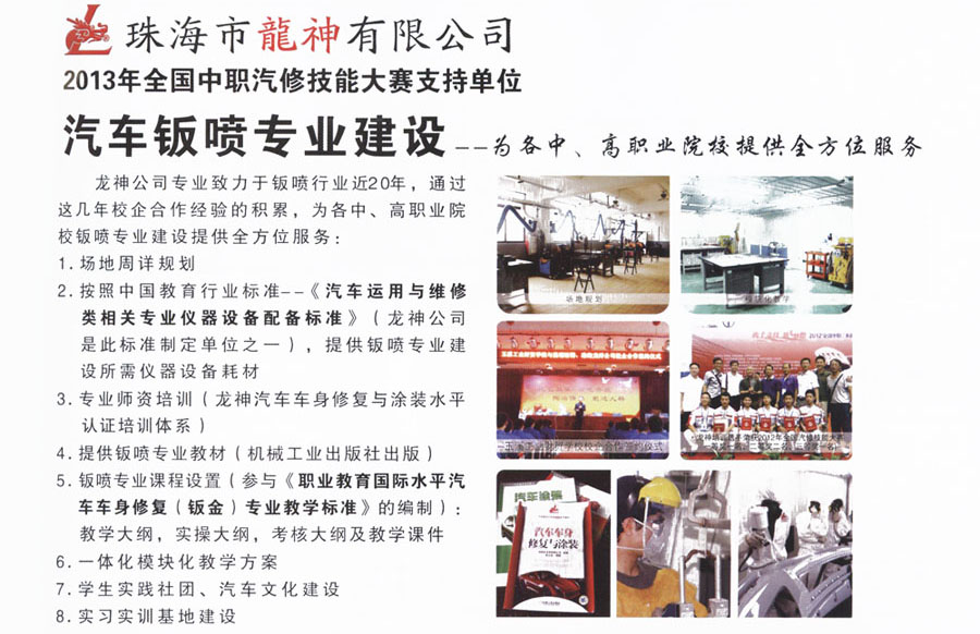 龍神汽車車身修復與涂裝 水平認證培訓體系 2013-06-03 25256 龍神公司專業(yè)致力于鈑噴行業(yè)近20年,通過這幾年校企合作經驗的積累,為各中、高職業(yè)院校鈑噴專業(yè)建設提供全方位服務。