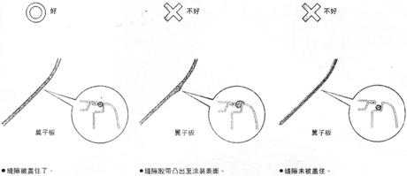 汽車維修噴涂中,有時會遇到不同板件之間的縫隙的遮蔽,如果還用遮蔽紙或普通膠帶遮蔽就比較困難,因為這些縫隙通常較窄,而最佳的遮蔽材料就是專業(yè)的縫隙膠帶??p隙膠帶可以使縫隙部位的遮蔽工作簡化,縮短整體維修時間??p隙膠帶的正確使用見圖4-3-6: